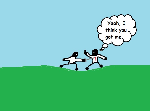 There is another odd thing that you may notice if you watch a few bouts. Sometimes one fencer will hold up an index finger after a touch. This is an acknowledgement that the opponent scored. It is used more often in practice when there is not a referee or when the fencers are being courteous and are helping out a fellow fencer that is trying his best to make the calls. In competition, it is more like saying, “Touche.”
