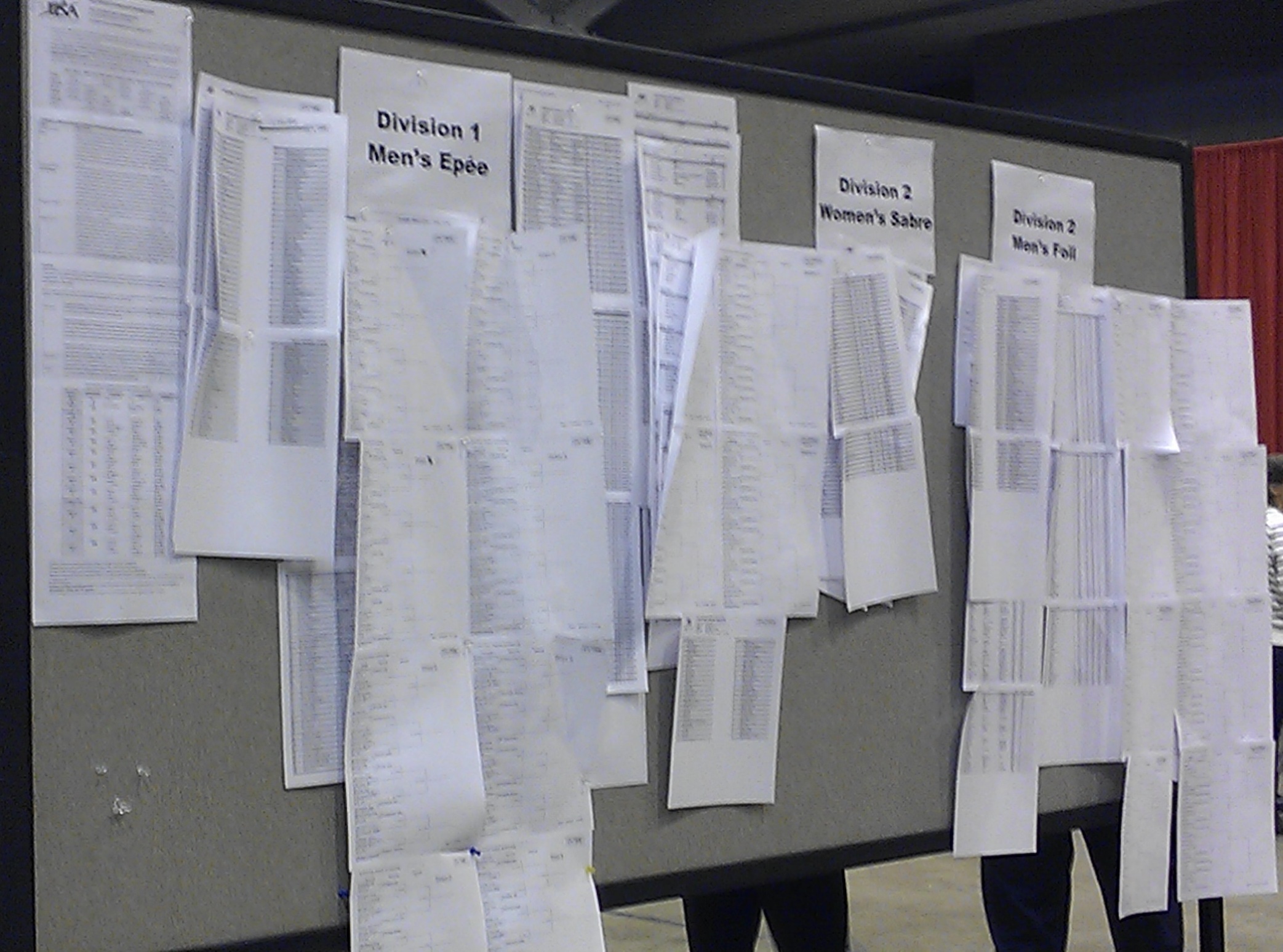 This tournament had several instant replay stations, more than I’ve ever seen before at an event. But despite all the technology, each fencer has to cluster around a simple bulletin board to find out which strip her bouts will be fenced on.
